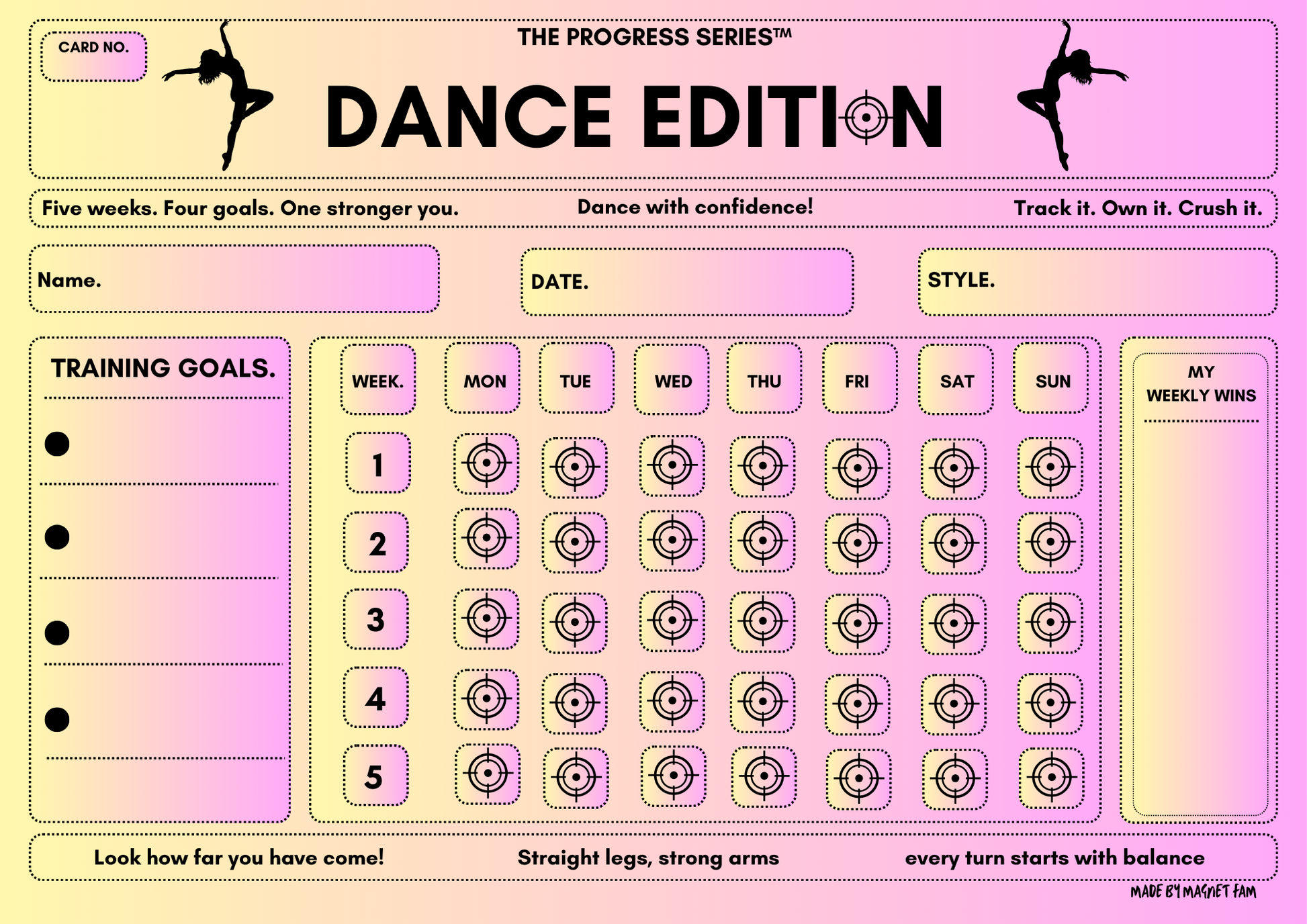 The Dance Edition Progress Chart helps dancers stay accountable to their training, technique, and practice routines. Designed to make effort visible, this chart turns daily practice into a motivating visual journey that builds discipline, confidence, and pride.